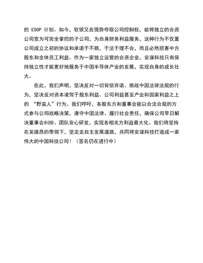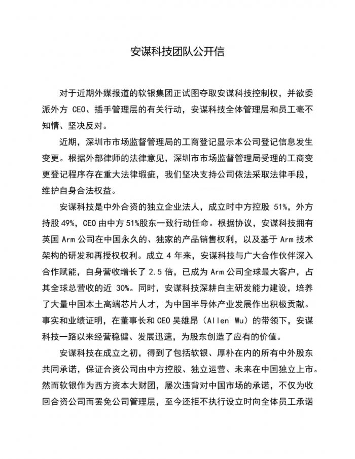 虽然软银团队已经强调将确保公司运作如常,在支持中国科技产业创新之路上砥砺前行。但就在29日下午,吴雄昂团队的安谋科技曾发布公开信,其中称“拒绝被软银实际控制,坚持自主发展。”