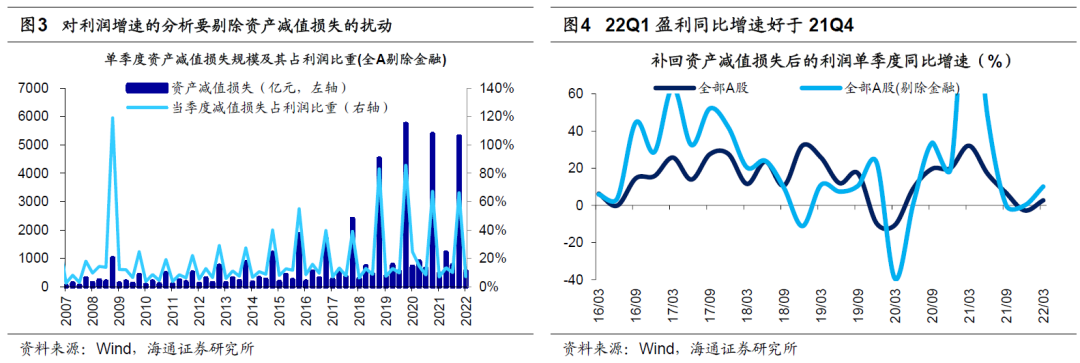 但是更精确的对比实际上还要看季度层面的变化,即拿22Q1单季度利润指标去和21Q4的单季度指标相比。对着两者做比较前需要进行会计处理来统一口径,因为上市公司每年在年报中会计提大量的资产减值损失(比如商誉),这会对四季度单季度的归母净利润产生显著的影响,而一季报中计提的资产减值损失微乎其微(见图3)。以2021年的数据为例,全部A股剔除金融后21Q4资产减值损失占归母净利润约为70%,而22Q1这一比例只有不到10%。为了剔除这一影响因素,我们需要计算一个新的利润口径叫减值损失前利润(即现有的利润补回这部分资产减值损失),在这一口径下全部A股22Q1利润增速为3%,好于21Q4单季度同比的-3%(由于基期20Q4数据正常,此处数据不需要两年年化处理),同理全A剔除金融的增速为10%,好于21Q4单季度的0%,即实际上22Q1的业绩增速较21Q4回升。