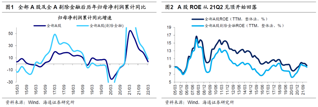 22Q1全部A股归母净利润同比增速为3.6%,较21Q4单季度同比回升。22Q1全部A股归母净利润同比增速为3.6%,21Q4单季度同比为-9.4%,2021年全年为18%(两年年化增速为9.7%),A股剔除金融分别为8.1%、-30.3%、25.4%(13.9%)。全部A股ROE(TTM,整体法,下同)22Q1 ROE为9.3%,21Q4为9.7%,A股剔除金融为8.9%、9.2%,ROE继续下行。从这些指标看,A股似乎盈利还处在下行通道。