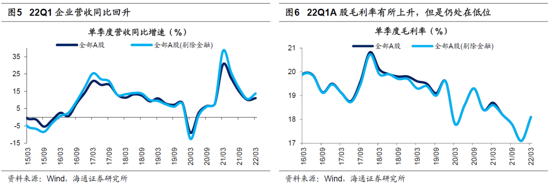 收入和利润率,22Q1均好于21Q4。拆解22Q1的盈利增速:营收角度,22Q1全部A股单季度营收同比是11%,相比21Q4单季度同比改善1个百分点;A股剔除金融22Q1单季度同比为14%,回升3个百分点。整体上,A股的营收还处在21Q1以来的下行趋势中,22Q1有所回升,这与GDP增速所代表的宏观环境变化基本一致,实际GDP当季同比增速从21Q1的18.3%下降到21Q4的4.0%,然后又上升至22Q1的4.8%。