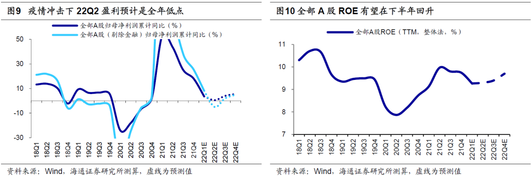综合来看,从营收角度,今年全部A股营收或略低于2021年(21年营收两年年化增速为10%),而从利润率角度,高油价对全A利润的侵蚀也基本能被加码的减税降费所抵消,因此综合考虑后我们预计全A剔除金融归母净利润同比今年大约为5-6%,考虑大金融后的全部A股归母净利润增速应该也在5%附近。节奏上看,由于Q2受疫情影响较大,而全年的GDP目标仍要努力达成,GDP同比增速预计会在Q2下滑,然后Q3-Q4回升,A股盈利增速的低点同样可能出现在今年二季度,我们测算全部A股22Q2归母净利润累计同比为0.5%,全A剔除金融为-5%,此后利润增速将逐季上行。相应的,我们预计全部A股ROE(TTM,整体法)于22Q3开始回升,全年预计为9.7%。