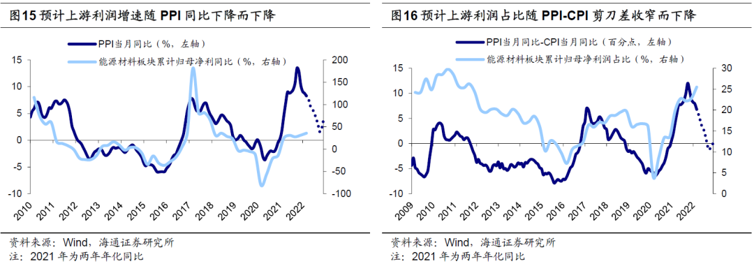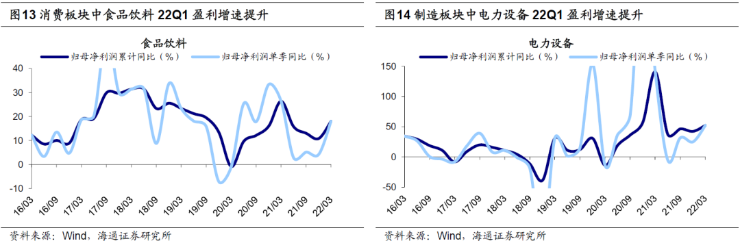 总体看,上游资源品盈利增速较快且盈利占比进一步上升,这是大宗商品涨价所致。从历史规律看,PPI同比与上游盈利增速大致同步,同时PPI-CPI剪刀差也跟上游利润占比趋势一致,一季度大宗商品涨价带动国内PPI上行,而CPI受制于猪价。因此22Q1上市公司盈利进一步向上游转移,而中下游盈利能力受挫,尤其是传统制造盈利下滑明显,部分高端制造行业表现较好。但是,随着今年PPI逐级回落,CPI开始上升,PPI-CPI剪刀差将相应缩窄,我们预计利润分布将向中下游转移,中下游盈利将有所改善。此外,在疫情冲击下消费一季度业绩受到较大影响,但目前深圳和吉林疫情已经得以控制,上海疫情处于回落中,未来疫情如果能够缓解,我们预计消费行业盈利有望修复。