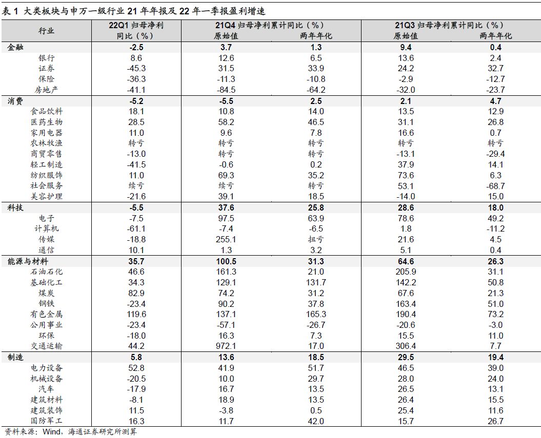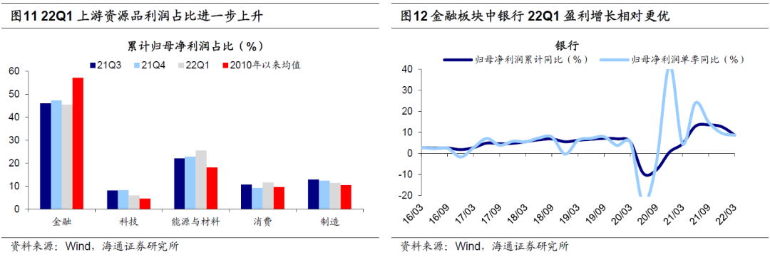 上游资源品盈利增速更快且占比进一步上升,中下游制造和消费盈利承压。从大类板块的利润分布来看,22Q1能源与材料板块归母净利润占比为25.5%,相比21Q4的22.8%进一步上升,并且明显高于2010年以来均值18.2%,而下游制造和科技板块22Q1归母净利润占比明显下滑,消费有所上行,金融小幅下降。从大类板块的利润增速来看,一季度仅有能源与材料板块盈利增速继续上行,22Q1归母净利润同比增速达到35.7%,远高于全部A股。而中下游的制造和科技盈利增速均出现较大幅度的下滑,仅有高端制造领域的电力设备和通信业绩增速上升。消费板块盈利增速延续下降趋势,但食品饮料行业盈利增速显著回升。金融板块业绩一季度主要受非银和地产拖累,银行盈利增速已经出现回暖。详细数据见下表。