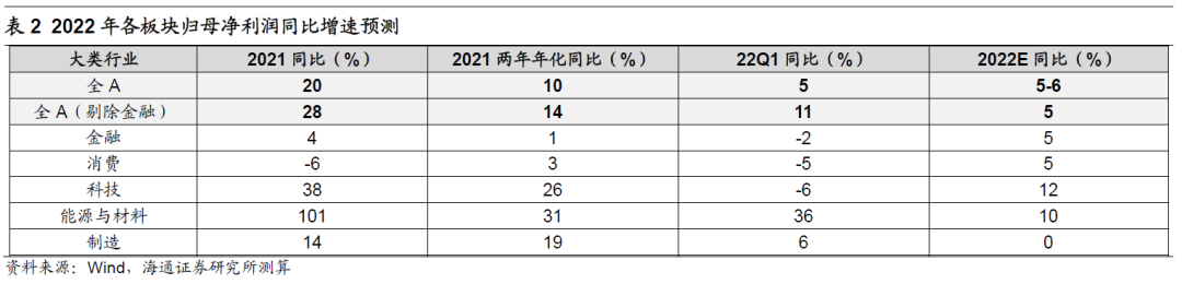 无需过度担忧疫情对需求的影响,全年GDP目标仍坚持,预计全部A股22年归母净利润同比在5-6%,季度低点在Q2。本轮疫情2月在各地零星发生,3月开始在深圳、吉林、上海等地出现。目前来看,本轮疫情对长三角的经济影响较大,珠三角和京津冀两个区域虽然也有疫情发生,但是防疫措施“以快制快”,疫情对实际经济的影响可能并不大。2021年长三角区域(苏浙皖沪)的GDP占全国GDP的比重大概是1/4,上市公司层面位于长三角的上市公司占全部A股营收的比重也是约1/4。假设这些公司在4月完全停摆,则全部A股全年的需求会被拖累约2%。但是实际上4月苏浙皖的经济并没有完全停摆,上海市内的经济也保持着较低的活力,同时4月缺失的部分生产和消费在疫情过后也可能补回来,因此疫情对总需求的影响可能不会有这么多。