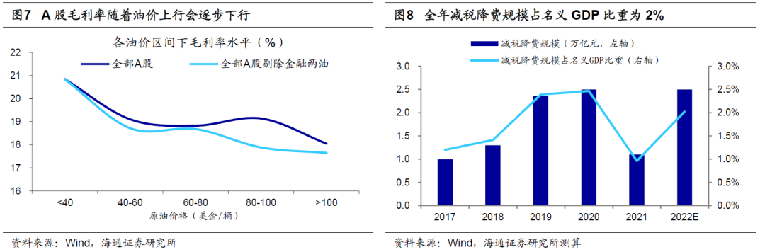 我们将2001年至今每个季度国际油价(WTI和布伦特的平均数)分成五个区间,即每桶40美金以下/40-60/60-80/80-100/100美金以上,然后计算各价格区间内全部A股的单季度毛利率。可以发现,随着油价中枢的上移,A股毛利率会逐步下行,这五个区间内全A毛利率平均为20.9%/19.1%/18.9%/19.1%/18.1%,全A(剔除金融石油石化)毛利率平均为20.9%/18.8%/18.7%/17.9%/17.7%。也就是说如果今年油价继续维持在当前90美金左右的高位,哪怕下降到80美金的中枢,相比于去年油价70美金的水平,高油价会导致全A利润率下降1个百分点左右。但是,和去年相比,今年减税降费的规模也变大了,去年全年减税降费1.1万亿,今年是2.5万亿,与名义GDP相比减税降费的比例抬升了1%。如果我们把这1%边际税率的下降视作全社会企业的平均水平,再假设上市公司能享受到同样程度的税收减免,那今年多降的1%税率刚好抵消了油价的负面影响。