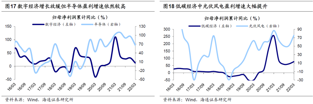 总结来看,稳增长背景下老基建产业链受益于政策发力,但政策效果尚未体现到上市公司一季报业绩上,板块整体盈利增速依然在下滑,不过细分的建筑装饰盈利增速明显提升。新基建也是稳增长的重要抓手,同时能兼顾中长期经济结构调整,包括数字经济和低碳经济两大方向。其中,低碳经济产业链22Q1归母净利润同比下滑至76.5%,主要是新能源车增长放缓所致,但产业链整体还是保持着高景气,受益于新基建投资加码的光伏风电盈利增速持续提高。新基建里的数字经济一季度盈利增长开始放缓,细分的半导体依然保持高增长,22Q1归母净利润同比高达66.7%,同时受益于基站建设的5G板块盈利增速也明显提升。困境反转方向,受猪价影响的猪产业链和受疫情影响的消费服务依然处于亏损状态,未来业绩改善还需观察猪价的变化和疫情防控的进展。