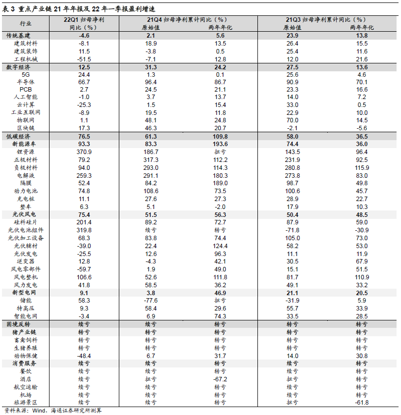 低碳经济业绩继续高增,数字经济盈利增长有所放缓,传统基建盈利增速继续下滑。上文从大类板块的角度对比了一季度各行业盈利情况,除此之外,目前市场上有几条重要的投资主线,包括传统基建、低碳经济、数字经济和困境反转,投资者对这些方向的细分领域关注度较高,所以我们沿着这些线索梳理各产业链的业绩情况。(详见表2)。