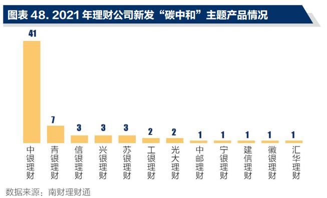 南财理财通数据显示,截至2022年3月11日,理财公司共发行80款以“碳中和”或“碳达峰”、“低碳”、“绿色”命名的绿色金融主题产品,且成立时间均在2021年之后。其中,2021年全年,有12家理财公司发行“碳中和”主题理财产品,发行数量合计66只(同一产品登记编码项下的不同子份额均纳入统计范围)。其中,中银理财发行“碳中和”主题产品最多,数量为41只,占发行总数的62.12%。青银理财次之,发行数量为7只;信银理财、兴银理财和苏银理财并列第三,发行数量均为3只。
