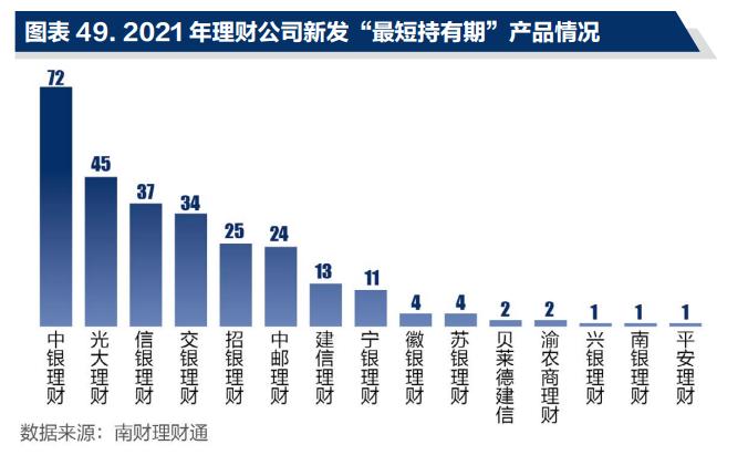 此外,在转型推动下,理财公司开始发行专精特新、乡村振兴、绿色金融、蓝色金融等主题产品,公募REITs成为重要的创新投资资产,最短持有期产品也在2021年迎来爆发。2021年可谓理财公司产品创新的大年。