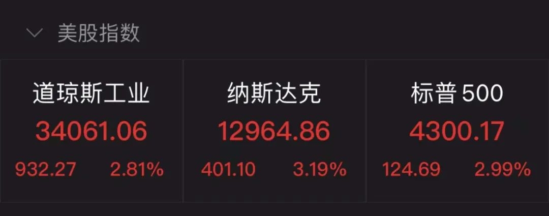 受上述消息影响,截至当地时间5月4日,美股三大指数大幅收涨,纳指涨401.10点,涨幅3.19%,报12964.86点;标普500指数涨幅2.99%,报4300.17点;道指涨932.27点,报34061.06点,涨幅2.81%。