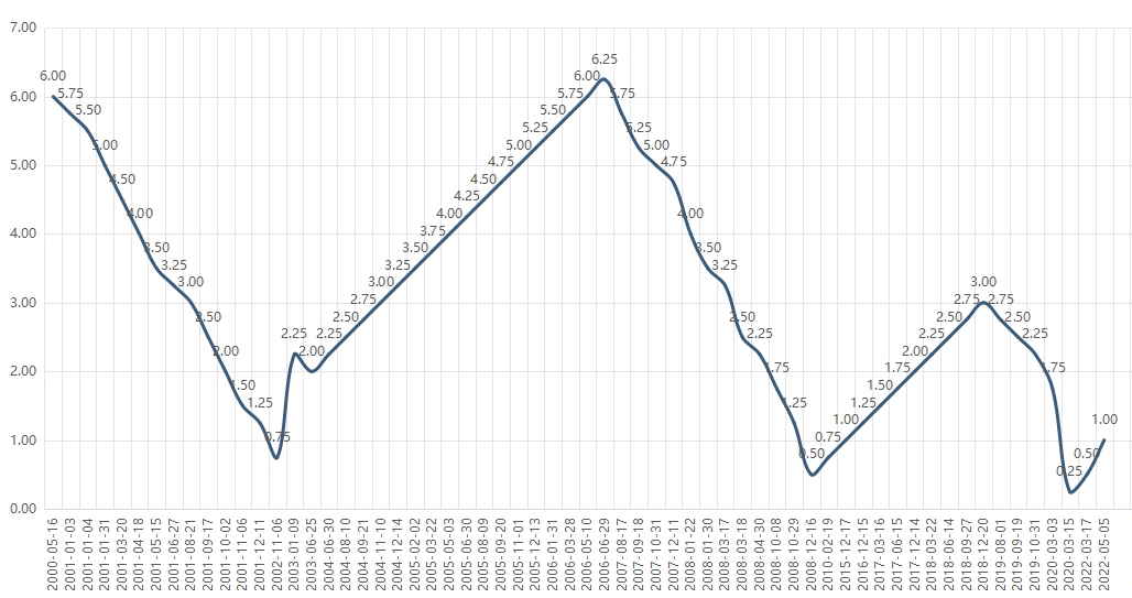 当地时间5月4日下午,美联储通过会议决定将美国联邦基金利率增加0.5%(即上涨50个基点),以降低美国高企的通胀率。加息后,联邦基金利率区间增至0.75%到1%。这也是美联储22年来首次一次升息0.5%。