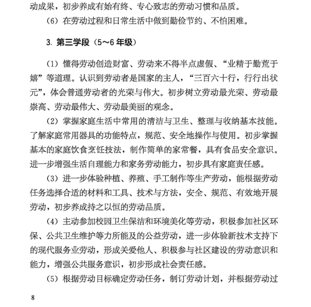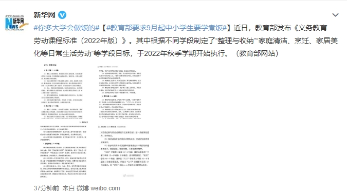 近日,教育部发布《义务教育劳动课程标准(2022年版)》。其中根据不同学段制定了“整理与收纳”“家庭清洁、烹饪、家居美化等日常生活劳动”等学段目标,于2022年秋季学期开始执行。