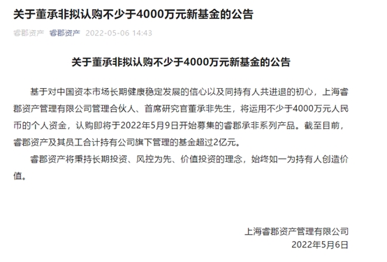 睿郡资产5月6日下午在其官方微信公众号发布的公告显示,公司管理合伙人、首席研究官董承非拟自购不少于4000万元新基金。