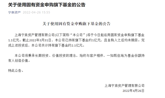 4月26日,知名股票私募宁泉资产在官微发布公告,称将自购旗下基金。