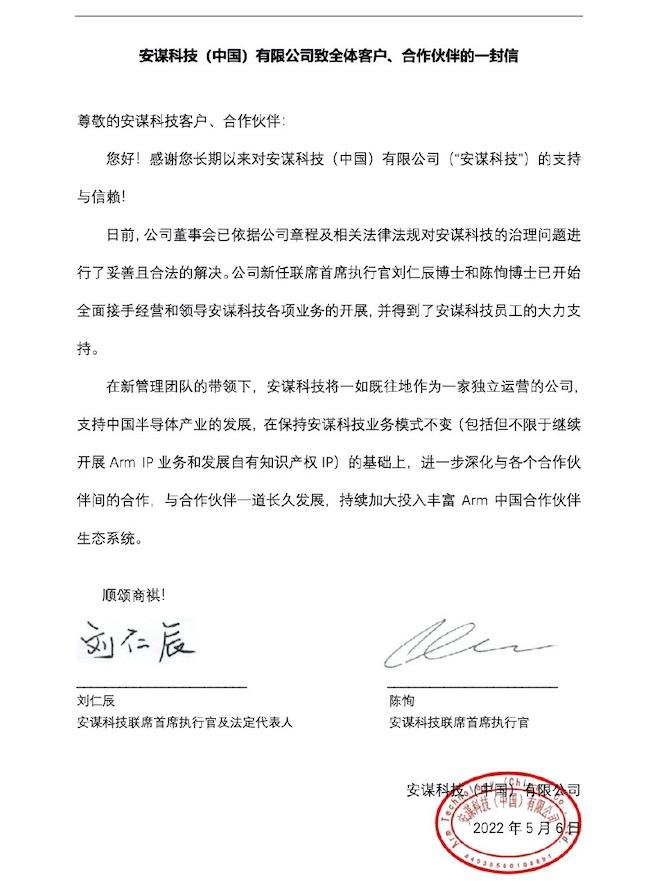 不久后,前述官方发布平台再发布一份《安谋科技(中国)有限公司致全体客户、合作伙伴的一封信》,其中表示,“日前公司董事会已依据公司章程及相关法律法规对安谋科技的治理问题进行了妥善且合法的解决。公司新任联席首席执行官已开始全面接手经营和领导安谋科技各项业务的开展,并得到了安谋科技员工的大力支持。”