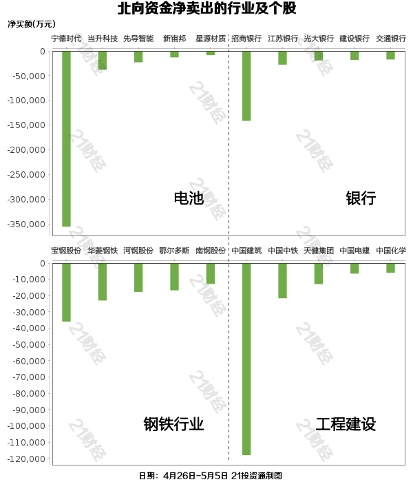 北向资金净卖出宁德时代(300750.SZ)、招商银行(600036.SH)、中国建筑(601668.SH)、海康威视(002415.SZ)、紫金矿业(601899.SH)居前,其中,宁德时代被净卖出35.57亿元,招商银行被净卖出14.15亿元,中国建筑被净卖出11.79亿元,海康威视被净卖出7.41亿元,紫金矿业被净卖出7.21亿元。