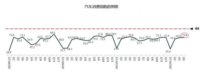 从消费端来看,4月份汽车消费指数为71.8。从构成汽车消费指数的分指数看,2022年4月需求分指数为72.6;入店分指数为80.8,买分指数为87.2,均高于上月。
