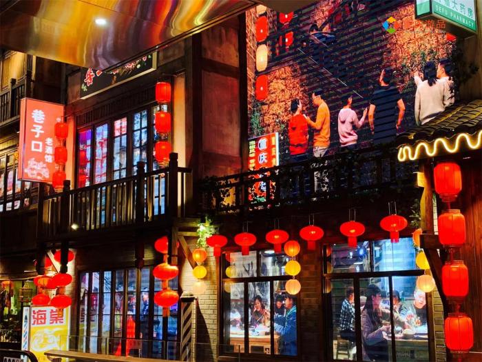 设计者们专门打造了一处“重庆味”中庭。中庭一角,重庆的老地名都在此呈现。中庭选取重庆地区特有的穿斗结构吊脚楼为建筑形式,提炼重庆地方元素,完美复刻了重庆独具特色的立体中庭空间。