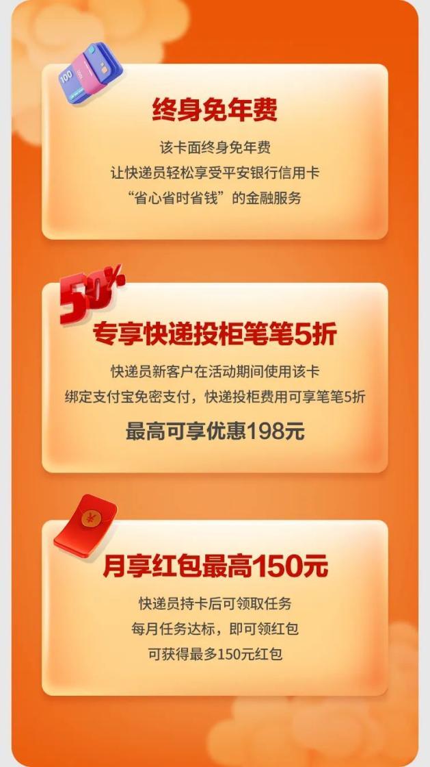 如“快递投柜笔笔5折”优惠,快递员新客户在活动期间使用指定卡片,投递包裹时可享笔笔5折,最高可享优惠198元。同时,每月任务达标即可领红包,最高可得150元,月月达标月月可领。此外,该卡面终身免年费,让快递员无忧享 “省心省时省钱”的金融服务。