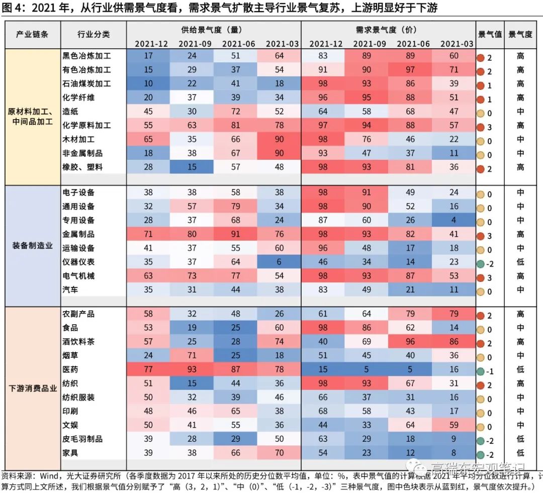 受全球经济复苏与大宗商品涨价带动,上游原材料制造业景气度显著改善,量价齐升,供需两旺,景气度达到了2018年以来的较高分位;