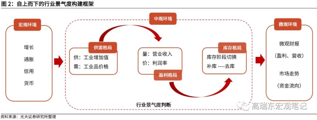 因此,行业景气度的研究在宏观研究中占据举足轻重的地位。行业景气是中观环境分析的重要抓手,它向上连接宏观环境,向下连接上市公司微观环境,是宏观研究落地市场的重要一环。