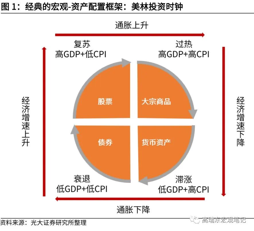 美林投资时钟便是一种经典的宏观-资产配置框架。2004年,美林证券基于对美国1973年到2004年的30年历史数据的研究,将经济周期与资产轮动联系起来,提出“美林投资时钟”。