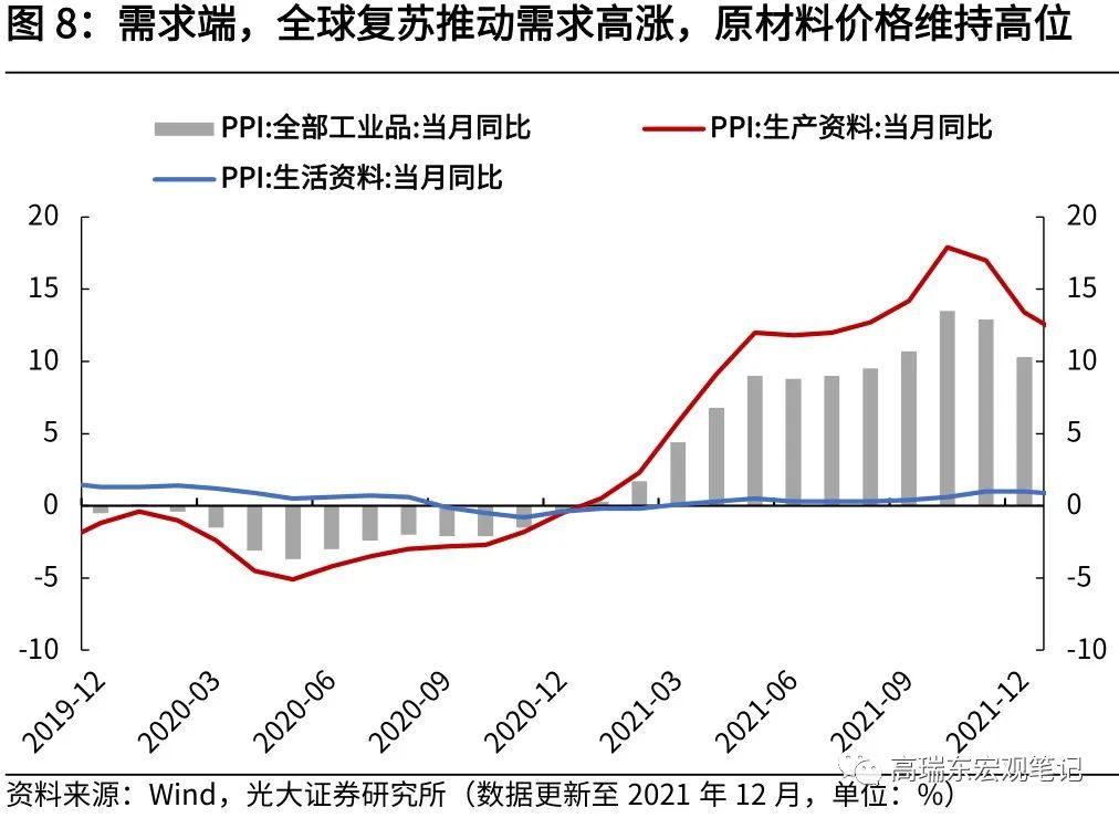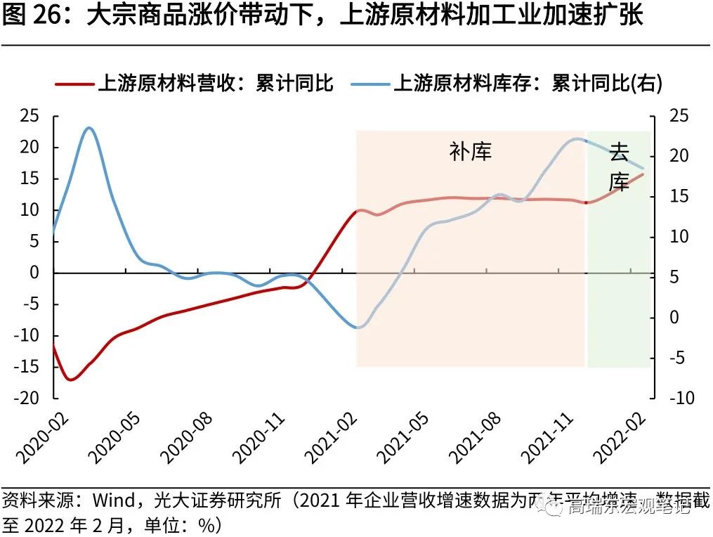 最后,大宗商品涨价带动下,上游原材料加工业加速扩张。今年以来,大宗商品价格上涨较快,带动上游采矿业与原材料加工业利润持续高增,企业扩产意愿强烈。2021年,原材料加工业利润增速持续位于高增区间,成为企业补库的核心支撑。原材料行业补库,主要以有色冶炼加工、黑色冶炼加工业为主。原材料行业补库主要受到两方面驱动因素:第一,大宗商品涨价带动下,企业利润高增,盈利增速是企业库存增速的领先指标,由此带动企业补库;第二,装备制造业补库带动了上游补库。
