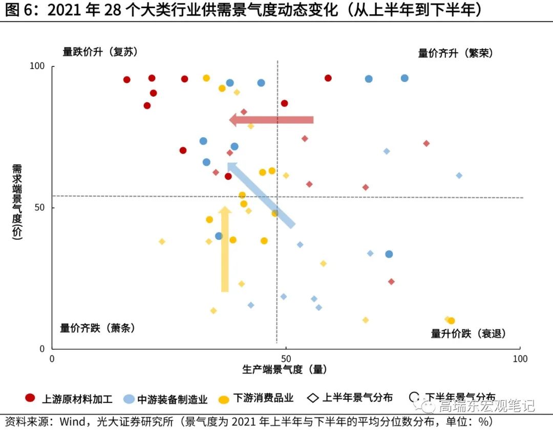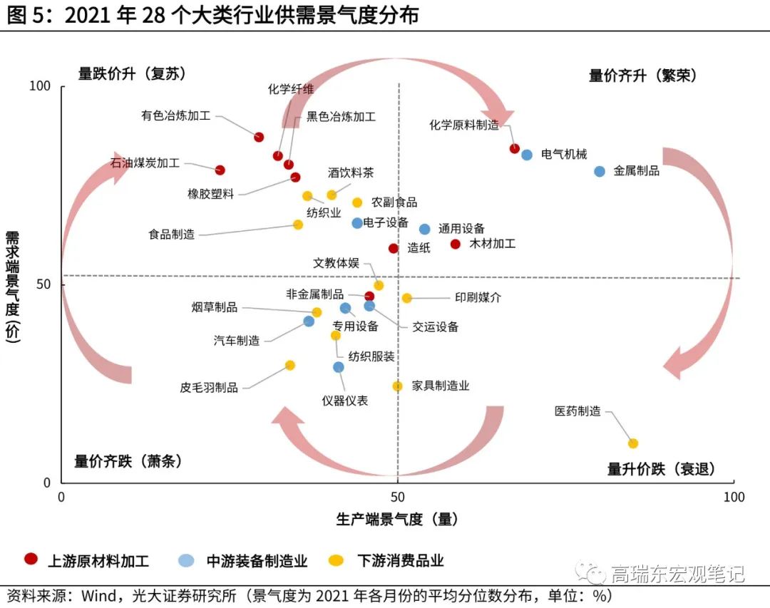 经过计算,我们得到28个大类行业,2021年以来的行业的供需景气度分布情况。为了进一步分析,我们将行业按上中下游进行了划分,上游对应原材料加工、中间品加工行业,中游对应装备制造业,下游则主要对应消费品制造业。整体来看,2021年,经济复苏在纵深推进,但是行业分化情况也愈发凸显。