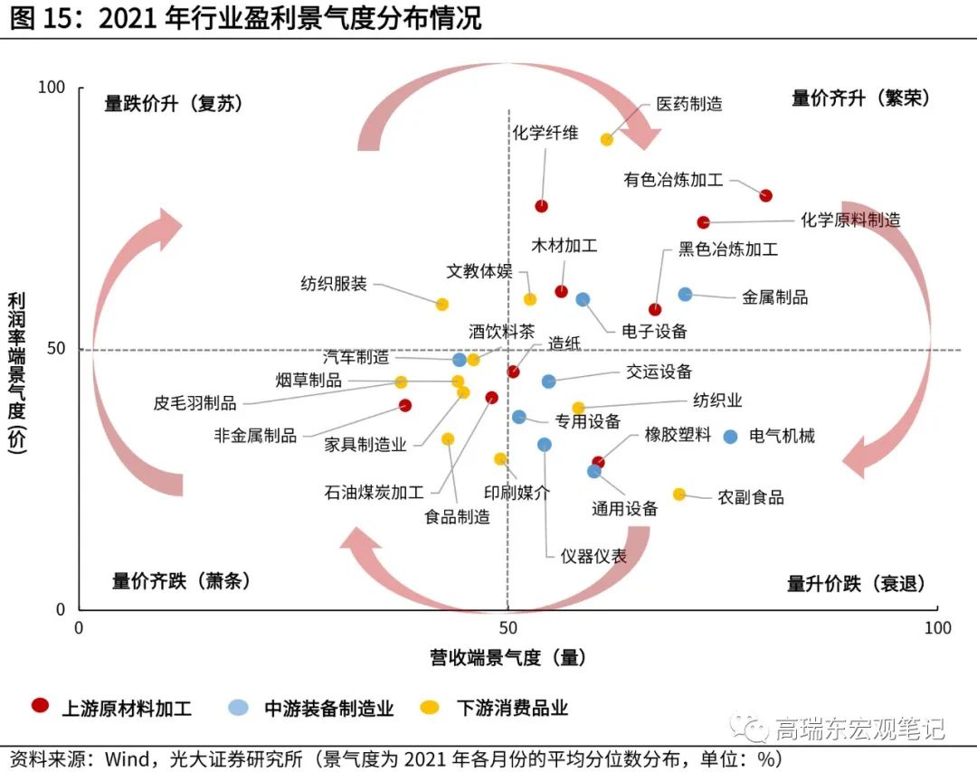 在营收增速(“量”)层面,整体来看,2021年原材料加工业与装备制造业均位于较高景气区间,而消费品制造业则处于较低景气区间。