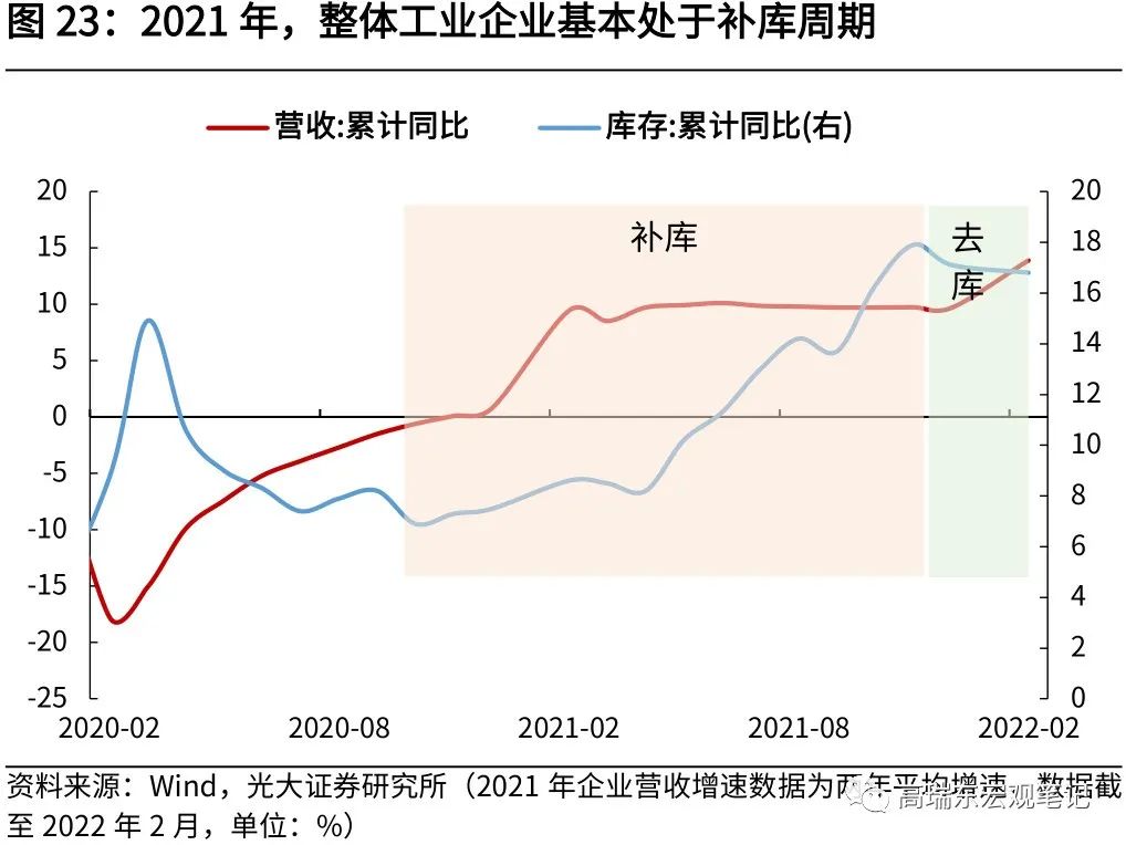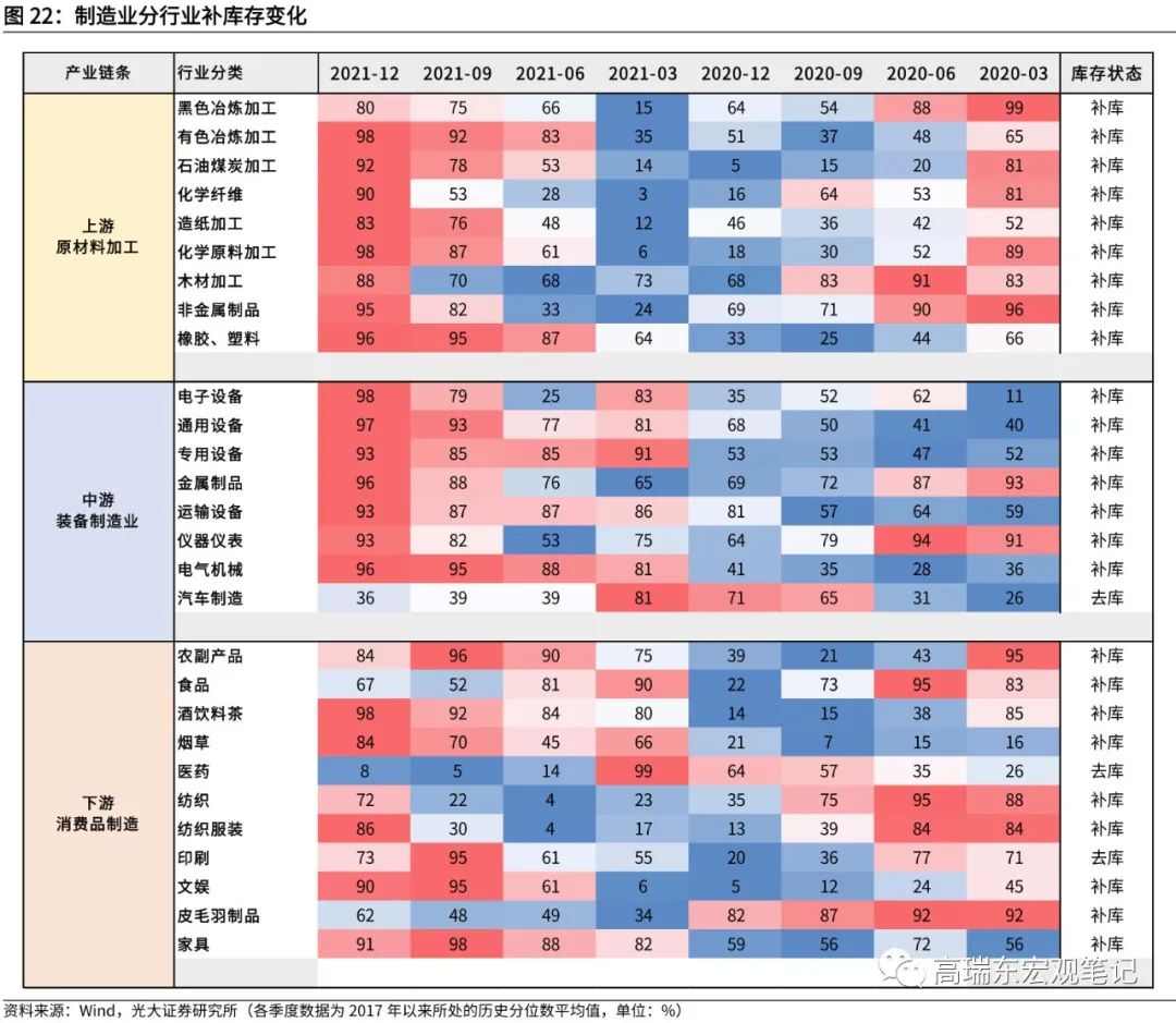 首先,从整体行业库存变化的节奏来看,2020年一季度,受疫情影响,整体经济首先出现了被动补库;此后需求先行复苏,供给恢复较为滞后,又出现被动去库的情况。2021年初,我国供给链不断修复,在全球复苏大背景下,中国产能供应全球,开始出现主动补库存的情况,这一趋势一直延续到2021年三季度;进入2021年四季度,需求有所收缩,企业开始相继进入被动补库存。从补库的行业结构来看,2021年企业主动补库持续,但是补库的行业结构却呈现了较为明显的变化,较早开启补库的原材料制造行业已转入去库阶段。