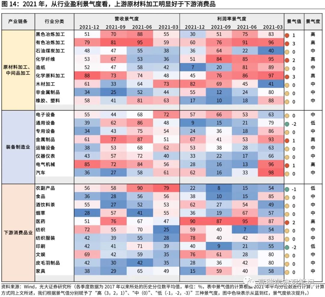 我们在前文,借助行业景气度的三因子模型,回顾了2021年各行业的景气度变化。具体来看,2021年行业景气度从高到低依次为:上游>中游>下游。