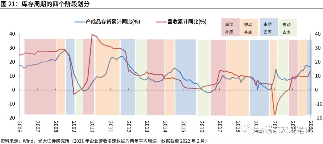 一个完整的库存周期也包括四个阶段:主动补库存——被动补库存——主动去库存——被动去库存。从逻辑上来讲,收入增速对库存增速存在一定的领先性。需求回升时收入(价格)增速最先显现,此时库存增速可能是回落的;而需求见顶时,收入(价格)也会见顶,由于企业反应滞后,库存会继续增加。结合收入增速与产成品库存增速可以对库存周期的四个阶段进行划分。