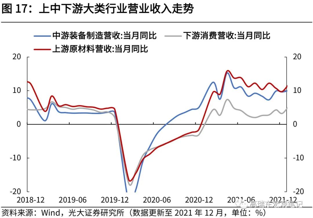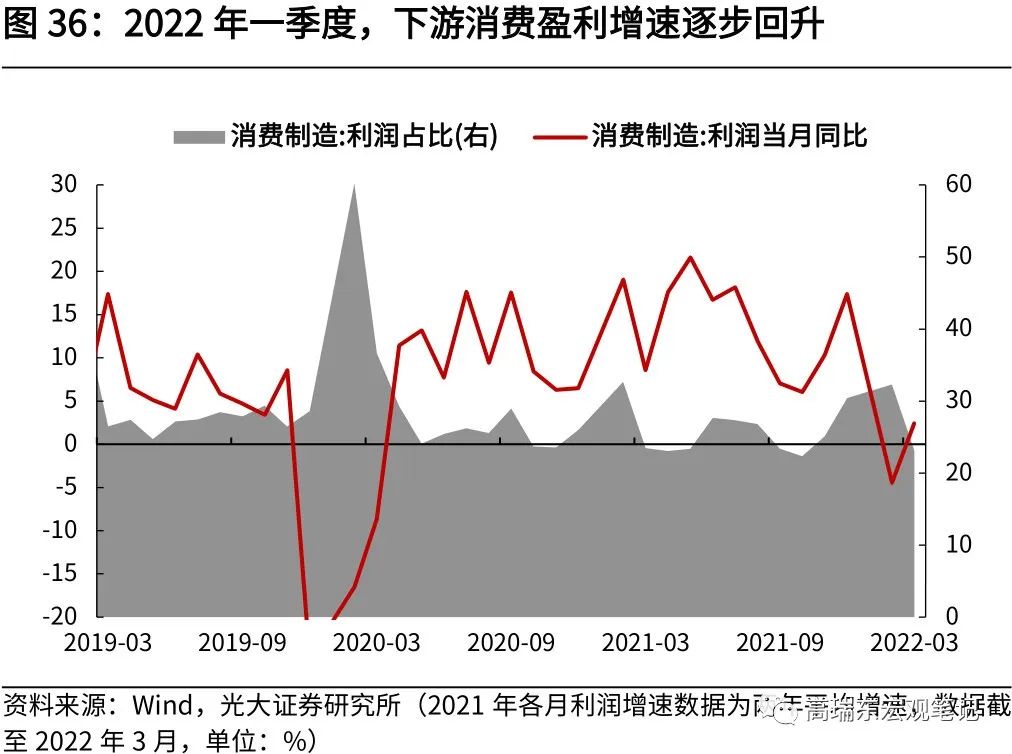 对于消费品制造业,必选品消费与可选品消费景气度出现分化。2021年上半年,必选消费品制造业营业利润率景气度有所恢复,而服装、家具等可选品消费制造业营业利润率持续处于低景气区间,未来盈利空间上涨或有限。2021年四季度以来,伴随上游价格回落以及消费价格温和上涨,消费品行业景气度有所回升。