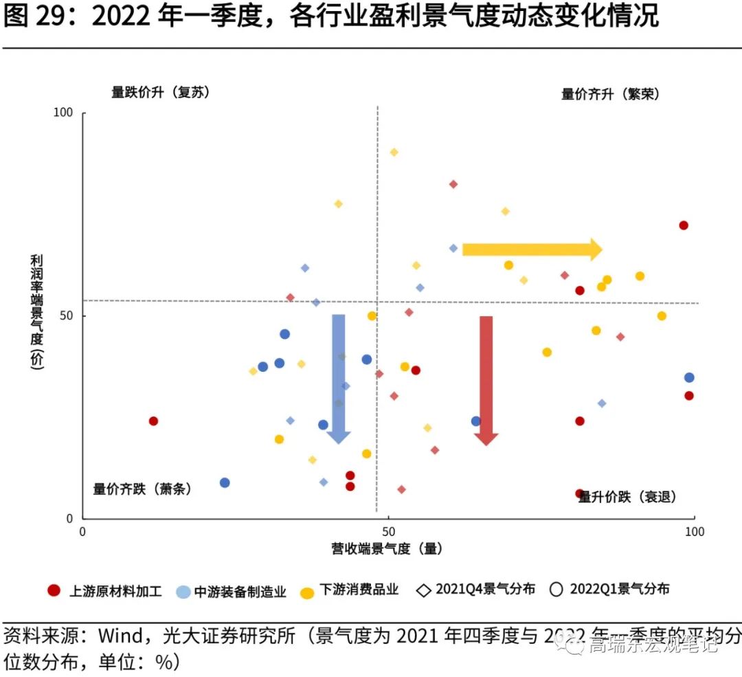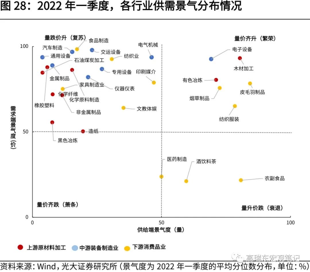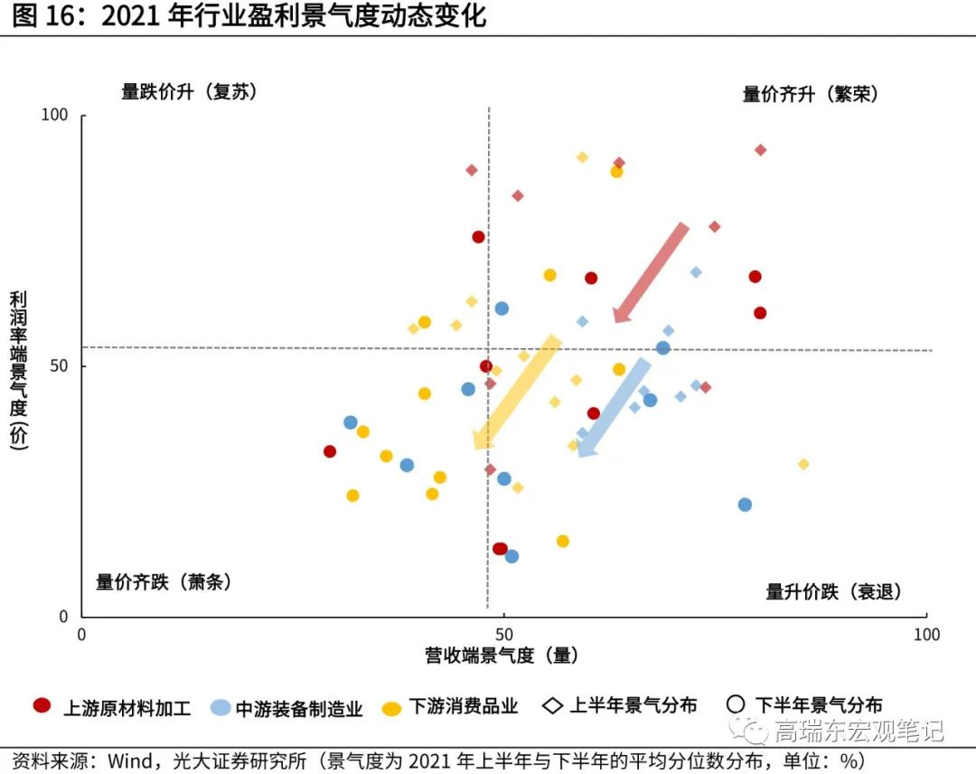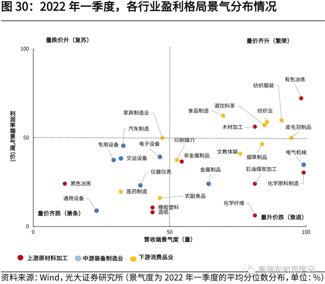 从营业利润率(“价”)的维度来看,原材料制造业继续高景气,装备制造业与消费制造业则由于受到上游涨价影响,利润率景气度有所下行。