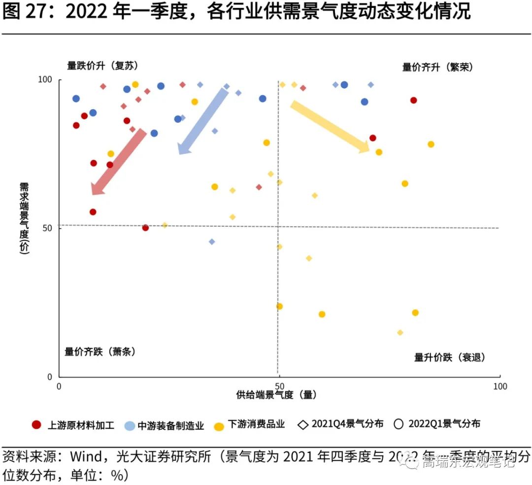 从景气度来看,2021年下半年,大部分消费品类行业,如农副食品加工、食品制造、酒饮料茶、烟草制品等基本处于“量价齐跌”的低景气区间,消费复苏缓慢;进入下半年,一些消费品,尤其是可选消费价格开始回升,景气状态发生切换,由“量价齐跌”向“量跌价升”转换,景气水平有所抬升。