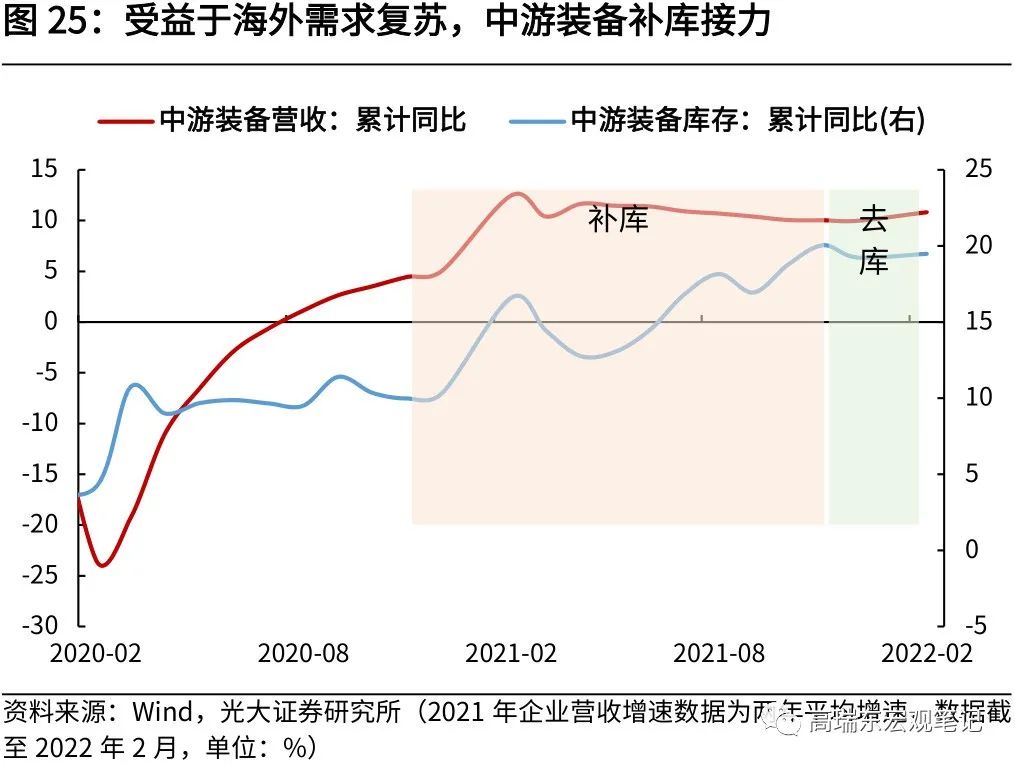 总体来看,2020年四季度以来,补库的行业结构大致经历了从“下游消费品业”到“中游装备制造业”再到“原材料加工业”和“中间品加工业”的阶段性变化,补库行业的变化与全球复苏的节奏相关,