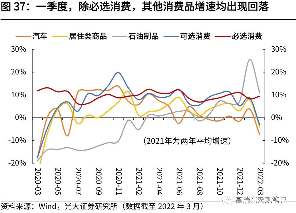 3月以来,疫情对于消费业带来了较大的冲击。3月社零增速转负,除了食品、药品等必选消费品外,其余消费品类增速均出现较大幅度的回落。从餐饮收入来看,3月餐饮收入同比增速自上月的8.9%回落至-16.4%,说明3月疫情散发,对居民线下出行和消费带来了较大的冲击。