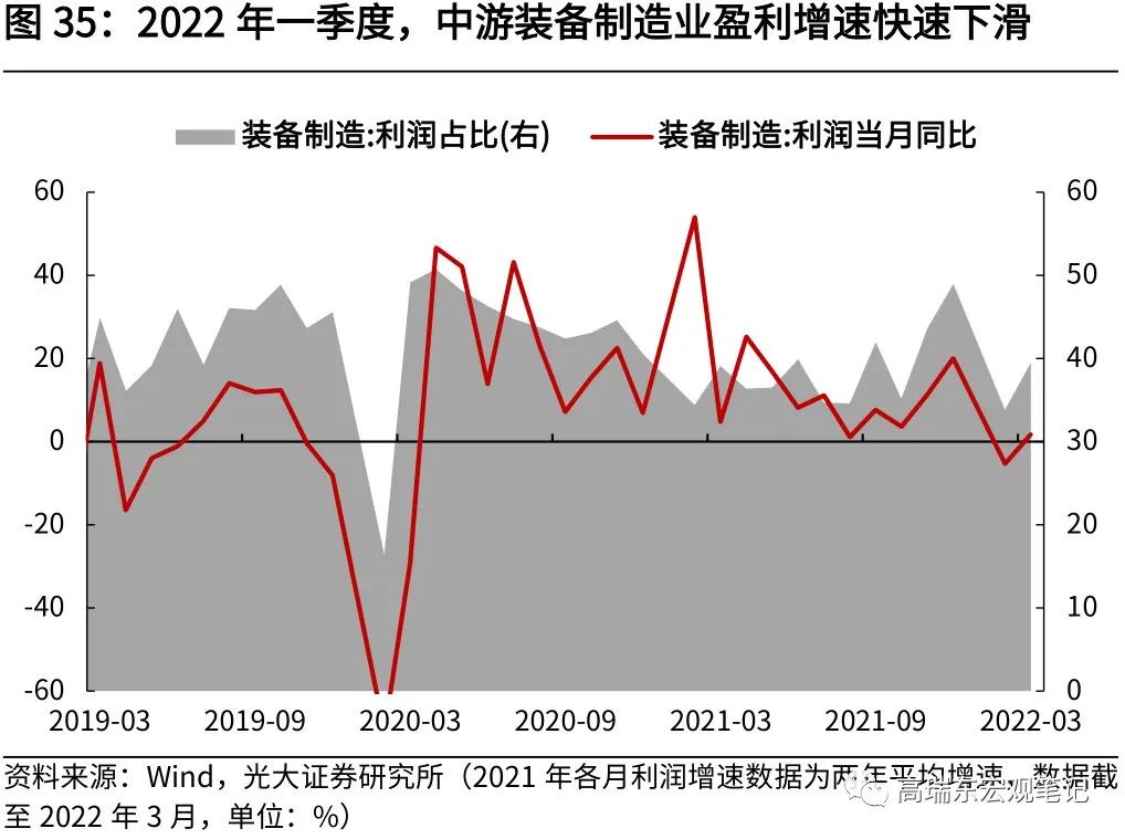 盈利格局方面,预计营收和利润率端景气均会有所回落,尤其表现在低技术链条。从今年一季度盈利表现来看,1-3月装备制造业利润总额同比增速为-2.28%,相比2021年12月回落37个百分点,分行业来看,低技术链条利润增速回落较快,高技术仍有韧性,受新能源汽车相关产业产能释放等因素推动,一季度,高技术制造业利润同比增长3.8%,其中电子通信设备制造业利润同比增长11.1%。