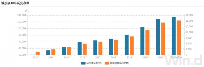 近年来城投债净融资规模持续为正,其余额在持续扩张。Wind数据显示,2013年城投债余额2.1万亿,2018年增加至6.8万亿,2021年末进一步增加至12.8万亿,相比2013年翻了5倍。尤其是2020年、2021年净融资规模分别高达2.3万亿、2.4万亿,年度新增规模超过2013年的存量。