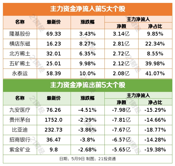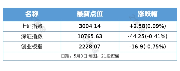 5月9日,沪深指数全天缩量整理,题材炒作多点开花。截至收盘,上证指数涨0.09%,创业板指跌0.75%,深证成指跌0.41%;两市成交额0.67万亿元。港股周一因佛诞日假期休市一日,沪深港通交易暂停。
