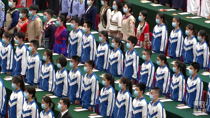 △大会开始后,全体起立,高唱国歌。(总台央视记者 黄京辉拍摄)
