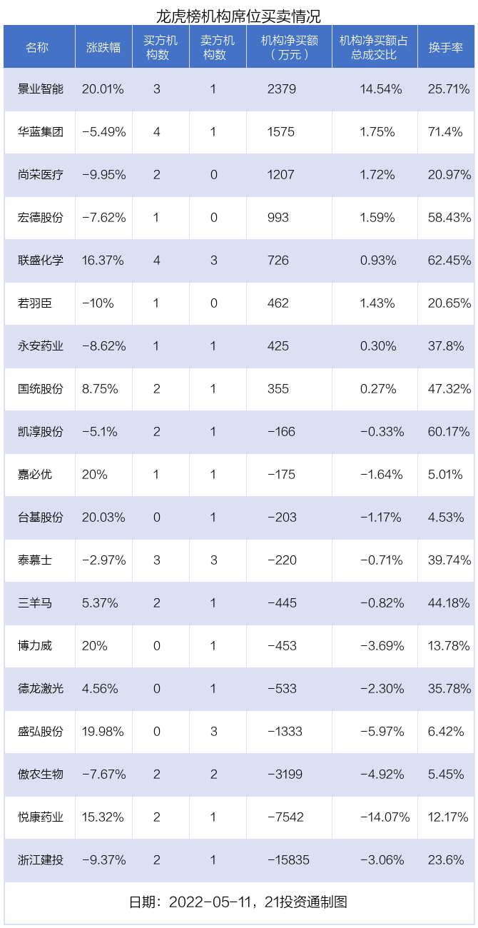 其中,机构净买入金额最多的是景业智能(688290.SH),当日收盘上涨20.01%,换手率为25.71%。前五大买卖营业部中有4家机构,为合计净买入2379万元,占总成交金额的14.54%。