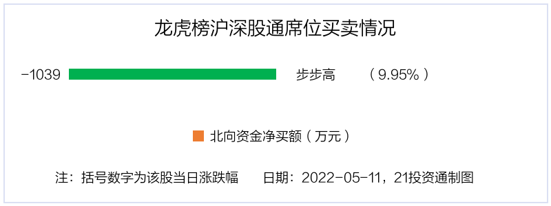5月11日,北向资金参与龙虎榜中的个股只有1只,深股通净卖出步步高(002251.SZ),金额为1038.96万元。