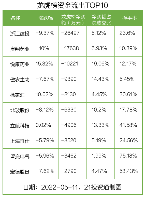 而龙虎榜中资金净流出最多的是浙江建投(002761.SZ),被净卖出为2.65亿元,占总成交金额的5.12%。浙江建投收盘下跌9.37%,换手率为23.6%。