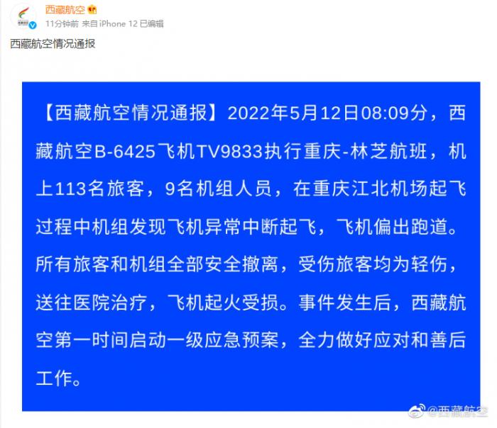 据“西藏航空”官方微博消息,2022年5月12日8:09,西藏航空B-6425飞机TV9833执行重庆—林芝航班,机上113名旅客,9名机组人员,在重庆江北机场起飞过程中机组发现飞机异常中断起飞,飞机偏出跑道。所有旅客和机组全部安全撤离,受伤旅客均为轻伤,送往医院治疗,飞机起火受损。