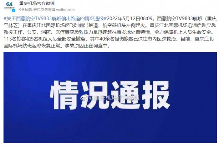 据“重庆机场官方微博”消息,2022年5月12日08:09,西藏航空TV9833航班(重庆至林芝)在重庆江北国际机场起飞时偏出跑道,航空器机头左侧起火。重庆江北国际机场迅速启动应急救援工作,公安、消防、医疗等应急救援力量迅速赶往事发地处置特情,全力保障机上人员生命安全。113名旅客和9名机组人员全部安全撤离,其中40余名轻伤旅客已送往市内医院救治。目前,重庆江北国际机场航班起降恢复正常。事故原因正在调查中。