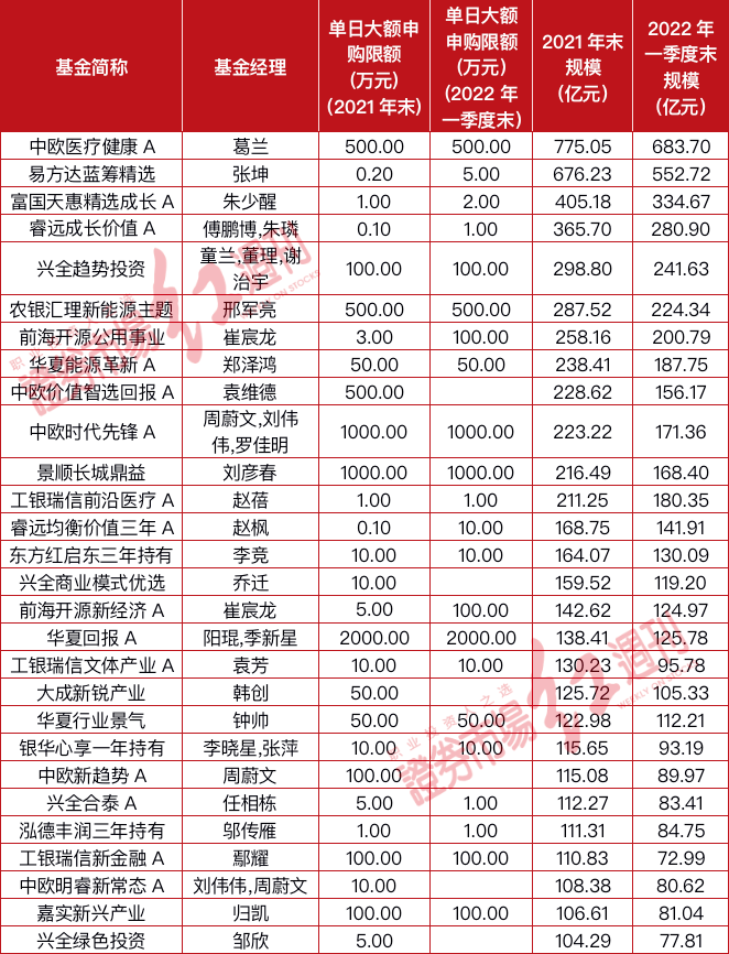 今年一季度,市场的下跌让基民损失惨重。与此同时,不少明星基金虽然净值受挫严重,但是基金经理还秉承了乐观的态度,大胆“开门迎客”。据《红周刊》统计,在28只年初还处于限额状态的百亿基金中,有10只都放开了大额申购或提高了单日最大申购限额。