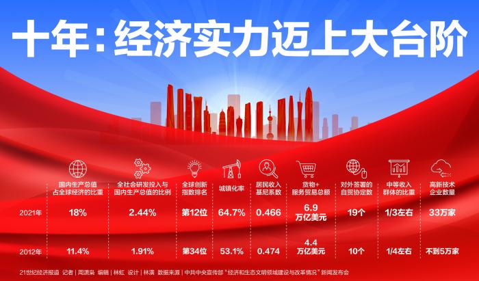 回顾这十年,我国在经济、创新、民生、生态、对外开放等领域取得了诸多重大成就,发布会提供了一系列含金量很高的数据。2021年我国GDP达到114万亿元,占全球经济比重由2012年的11.4%提升到18%以上,我国作为世界第二大经济体的地位得到巩固提升。2021年我国人均GDP达到1.25万美元,接近高收入国家门槛。按照联合国的标准,我国人民生活已经进入相对殷实富足阶段。