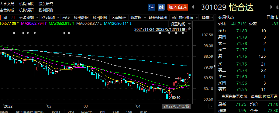 5月12日,怡合达收盘价为71.75元/股,当日股价下跌2.65%,总市值287亿元。5月以来,怡合达股价上涨7.7%。