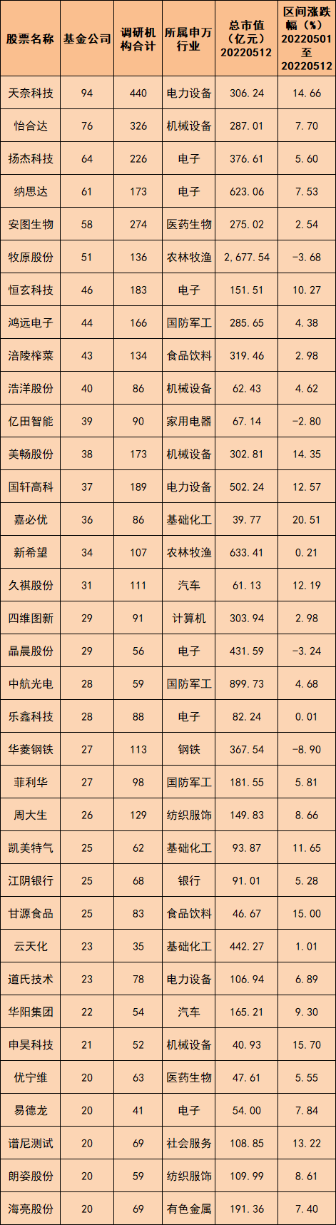 此外,所属半导体行业的扬杰科技、纳思达在5月份均被超过60家基金公司调研。截至5月12日,扬杰科技、纳思达在5月股价分别上涨5.6%、7.53%。